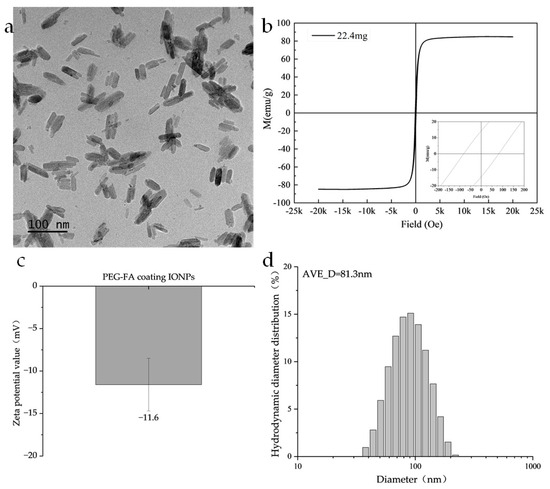 The nanoparticles used in this study were PEG-FA-coated IONPs, in which PEG provided the nanoparticles with good biocompatibility and dispersion, and folic acid (FA) provided good tumor targeting [32]. As shown in Figure 2a, TEM images show that the Fe3O4 nanoparticles are rod-like with a length of 60 nm and a diameter of 20 nm. Regarding the magnetic characterization, the magnetic properties of the samples were systematically evaluated in this study using a Lakeshore Model 7404 Vibrating Sample Magnetometer (VSM). The measurements were conducted at a constant temperature of 300 K and under an applied magnetic field of ± 2.17 T. As shown in Figure 2b, its saturation magnetization is 84 emu/g, the coercivity is 83.1 Oe, and the remanence is 14.2 emu/g. As seen in Figure 2c, its zeta potential is −11.6 ± 3.1 mV, which has good colloidal stability. In Figure 2d, its hydrodynamic diameter is distributed around 81.3 nm.