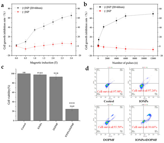 Effects of MMT via the combination of DOPMF and IONPs on A375 melanoma cell viability. (a) Magnetic field intensity-dependent effects on cell viability; A375 cells were treated with MNPs and exposed to DOPMF (10 Hz, n = 1200); the cell growth inhibition rate increased as the magnetic field intensity escalated (0.5 T, 1 T, 1.5 T, 2 T, 2.5 T, and 3 T). (b) Pulse number-dependent effects on cell viability; A375 cells were treated with MNPs and exposed to DOPMF (1 T, 10 Hz); the cell growth inhibition rate increased as the pulse number escalated (n = 120, 1200, 4000, 6000, and 12,000). (c) Efficacy of MMT; control group: without any treatment; IONPs group: A375 cells treated with 300 μL of MNPs (100 μg/mL; 20 × 60 nm Fe3O4 nanorods); DOPMF group: A375 cells exposed to DOPMF (intensity: 3 T; frequency: 10 Hz; pulse number: n = 4000; intermittent treatment: 2 min on/1 min off); IONPs + DOPMF group: A375 cells co-treated with IONPs and exposed to intermittent DOPMF. The data are represented by mean ± standard deviation (mean ± SD); *** extremely significant difference (p < 0.001) by Tukey’s multiple comparisons; N = 5. (d) Results of YP1/PI dual staining assessed by flow cytometry. Control group: without any treatment; IONPs group: A375 cells treated with 300 μL of MNPs (100 μg/mL; 20 × 60 nm Fe3O4 nanorods); DOPMF group: A375 cells exposed to DOPMF (intensity: 3 T; frequency: 10 Hz; pulse number: n = 4000; intermittent treatment: 2 min on/1 min off); IONPs + DOPMF group: A375 cells co-treated with MNPs and exposed to intermittent DOPMF.
