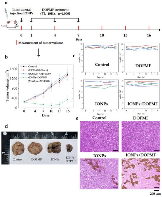Building on the success of in vitro cell experiments with DOPMF, we established a BALB/c NUDE mouse model bearing A375 melanoma tumors to further validate the efficacy of this LDCD strategy. When tumor volumes reached ~250 mm3, 24 A375 tumor-bearing mice were randomly divided into four groups: control, IONPs, DOPMF, and IONPs + DOPMF. One day prior to treatment, the control and DOPMF groups received intratumoral injections of PBS (volume equivalent to half the tumor volume), while the IONPs and IONPs + DOPMF groups were injected with IONPs (20 × 60 nm nanorods, 30 mg/mL concentration); these two groups were subjected to three sessions of MMT (3 T, 10 Hz, n = 4000 pulses, intermittent treatment: 2 min on/1 min off) at 2-day intervals. Tumor volumes and weights were measured every 3 days during the treatment period. The schematic diagram of the treatment process is shown in Figure 5a.