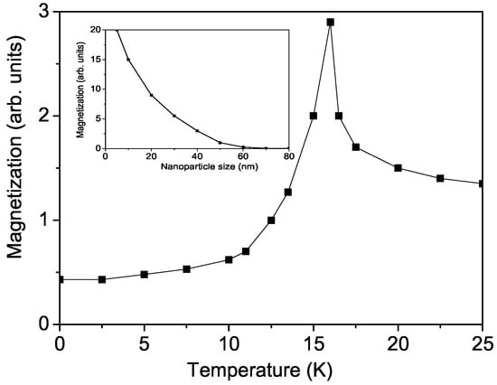 Now, we will consider the substitution effects of ion doping in CFO NPs at the Cu+ sites, for example with Li+. The ionic radii of the both ions are 0.91 Å and 0.90 Å, respectively, i.e., there appears a small compressive strain. The exchange-interaction constants at the doped states are larger than those in the undoped ones: . This leads to a small increase in the magnetization M (see Figure 2, curve 4). A similar behavior is also reported by Dai et al. [15] in bulk CFO. We obtain a similar result for Ca-doped CFO at the Cu site; see Figure 2, curve 5. It is important to note that the stability of the antiferromagnetic phase at low temperatures is affected by Li doping, as both antiferromagnetic and ferromagnetic phases coexist, and Li doping enhances the ferromagnetic interactions.