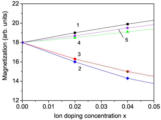The opposite result compared to that by Mn ion doping is obtained by substituting the Fe3+ with Mg2+ ions. The ionic radius of the doping Mg ion is 0.86 Å, i.e., larger than that of the host Fe ion. This leads to a tensile strain, to an increase in the lattice parameters, and to the following relation of the exchange-interaction constants: . So, from Equation (5), we observe a decrease in the magnetization M with increasing Mg dopant. The result is shown in Figure 2, curve 3, and coincides with the reported experimental data of Bera et al. [12] in CFO thin films and Chang et al. [34] in bulk CFO.