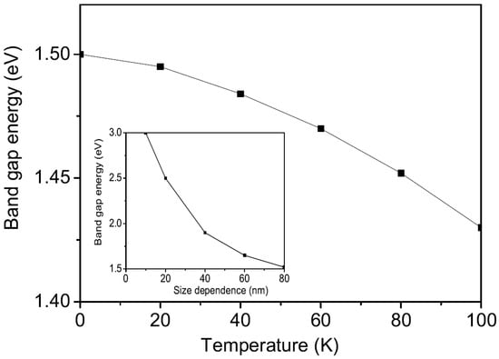 The temperature dependence of the band-gap energy in CFO. Inset: the size dependence of the band-gap energy in CFO.