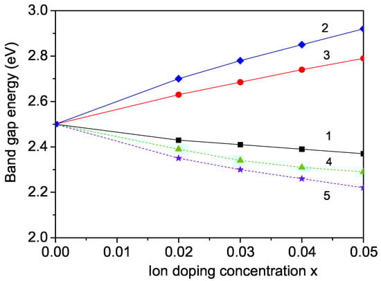 Doping concentration dependence of the band-gap energy in a CFO NP with d = 20 nm for (1) Mn, (2) Sc, and (3) Mg ions at the Fe site, (4) Li, and (5) Ca ions at the Cu site.