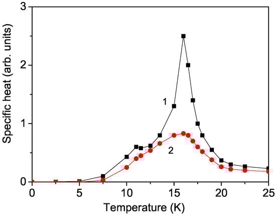To validate our model, we have calculated the temperature dependence of the specific heat for bulk CFO using the equation , where H represents the full Hamiltonian. Longitudinal and transverse correlation functions are involved, which are computed using the spectral theorem from the corresponding Green’s functions. The result for is shown in Figure 5, curve 1. Two peaks are observed at the two phase-transition temperatures in CFO: = 11 K and at = 16 K. A similar behavior has been reported by Maouhoubi et al. [28], providing evidence that our model is valid. It must be emphasized that CFO exhibits successive magnetic transitions as the temperature decreases: first from a paramagnetic state to a partially disordered phase at (approximately 16 K), and subsequently to an antiferromagnetic phase at (around 11 K) (refer to the Introduction). The transitions at and are reflected in the magnetic susceptibility curve by a peak at and a pronounced drop at [27].