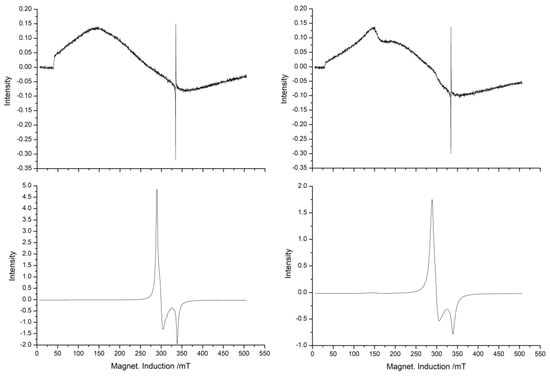 ESR spectra of 1 (left) and 2 (right) at 295 K (top) and 77 K (bottom).