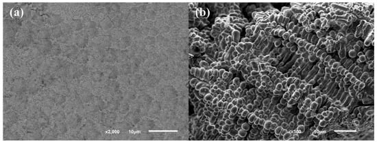 The morphological observations of the Sm5LaMn23 melt-spun ribbons and the Sm2La4Mn23 ingot are shown in Figure 3. A clear phase separation of the main particulate phase separated by the inter-grain phase was observed in the melt spun ribbons, in agreement with the XRD results. The size of a domain which contains many grains with different orientations is around 3 μm or less, resulting in a broadening of the XRD diffraction peaks. It is interesting that the Sm2La4Mn23 ingots show a quite different morphology of well-ordered particles with a smooth surface and spherical dimensions of 15 μm. The formation of the unique shape of the Sm2La4Mn23 alloy is not clear. As mentioned above, the spherical micro-particles are mainly composed of α-Mn, owing to the instability of the Th6Mn23 phase at this composition.