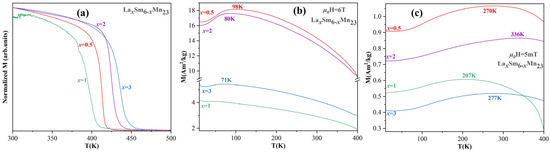 The temperature dependence of magnetizations of Sm6−xLaxMn23 (x = 0.5, 1, 2 and 3) measured under an applied magnetic field of 6 T and 5 mT is shown in Figure 4b,c. Under an applied field of 6 T, the temperature of peak magnetization of LaxSm6−xMn23 (x = 0.5, 2 and 3) ranges from 71 K to 98 K, and that of Sm6−xLaxMn23 (x = 0.5, 2 and 3) ranges from 207 K to 336 K at 5mT. The temperature shift in peak magnetization under a varied magnetic field may indicate the different M-T behaviors of different magnetic sublattices under varied applied magnetic fields. The maximum magnetization of Sm5.5La0.5Mn23 reaches 18.15 Am2/kg at 6 T and 98 K. Noticeably, the melt-spun Sm5LaMn23 ribbons show no obvious maximum magnetization at 6 T, while it exhibits a peak magnetization at the temperature of 207 K at 5 mT, owing to the field effect.