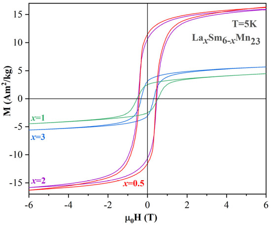 The magnetic hysteresis loops of Sm6−xLaxMn23 (x = 0.5, 1, 2 and 3) measured at 5 K.
