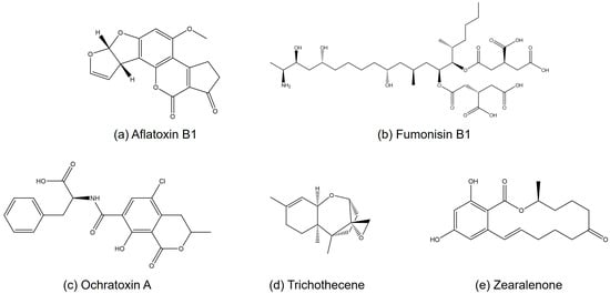 Mycotoxins are commonly classified on the basis of their chemical structures, biological effects, fungal origins, and mechanisms of action. They can also be categorized by their chemical constituents, including polyketides, lactones, alkaloids, terpenes, and other organic compounds. For instance, aflatoxins constitute a distinct group of mycotoxins characterized by a bisdihydrofuran ring structure. In this review, mycotoxins are further classified into five major groups—aflatoxins, ochratoxins, fumonisins, trichothecenes, and zearalenone—on the basis of their target organs and toxicological mechanisms. The representative chemical structures of each group are illustrated in Figure 2.
