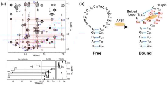 Xu et al. [17] reported the first high-resolution solution NMR structure of the AFB1–DNA aptamer (AF26) complex, revealing a novel induced-fit recognition mechanism. Upon AFB1 binding, the unstructured loop region of the aptamer undergoes conformational folding to form a compact binding pocket stabilized by G·C base pairs, a G·G·C triple, and five thymine residues that wrap around the toxin. Extensive 2D NMR analyses, including NOESY, COSY, TOCSY, HMBC, and 31P–1H COSY, enabled full resonance assignment and identification of intermolecular interactions (Figure 3).