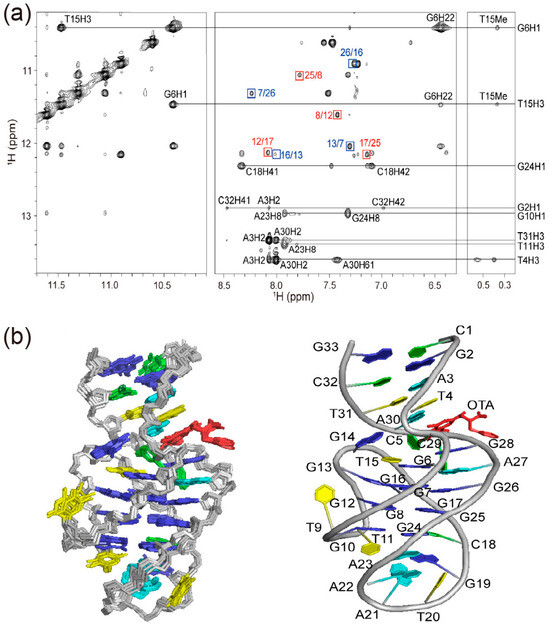 NMR characterization of the ochratoxin A (OTA)–aptamer complex: (a) 2D NOESY NMR spectrum showing intermolecular nuclear Overhauser effects (NOEs) that define the spatial orientation of OTA within the binding site; (b) 3D-NMR-derived structure illustrating how OTA is stabilized in the major groove by π–π stacking and hydrogen bonding. Reprinted with permission from Ref. [11]. Copyright 2022 American Chemical Society.