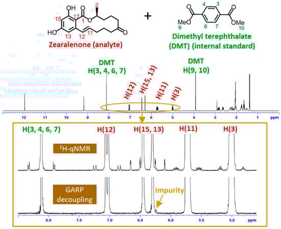 Purity of zearalenone was determined with dimethyl terephthalate as the internal standard at 400 MHz in acetone-d6. Globally optimized alternating-phase rectangular pulse (GARP) decoupling revealed a low-level impurity concealed by a 13C satellite in the 1H-qNMR spectrum. Reprinted with permission from Ref. [43]. Copyright 2020 American Chemical Society.