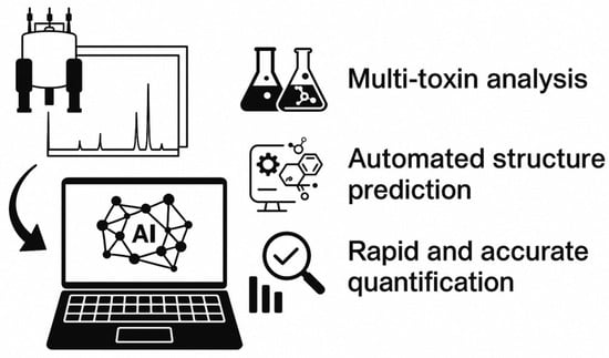 These developments indicate that the integration of AI into NMR spectroscopy could address key challenges in mycotoxin analysis. AI-based modelling approaches can assist in extracting structural information from complex spectral patterns, identifying toxin-specific features in mixtures, and streamlining the quantification process with improved consistency and speed. As illustrated in Figure 6, this integration enables efficient workflows that support the simultaneous evaluation of multiple compounds, facilitate the automated recognition of structural characteristics, and improve the speed and reliability of quantitative analysis. Such an approach has the potential to significantly broaden the utility of NMR spectroscopy in mycotoxin research, particularly in high-throughput and quality-assured analytical settings.