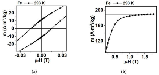 The magnetic properties of Fe nanoparticles were investigated using a vibrating sample magnetometer, Lake Shore Cryotronics (VSM, Lake Shore 7404, Westerville, OH, USA), at room and liquid nitrogen temperatures. For the measurements, samples of Fe nanoparticles were prepared using a two-magnet system and GE-7031-CT Thermal Varnish (CRYO-Technics, Büttelborn, Germany) (polyvinyl butyral, PVB). PVB is a random terpolymer composed of vinyl alcohol and vinyl butyral with relatively small amounts of vinyl acetate [32].