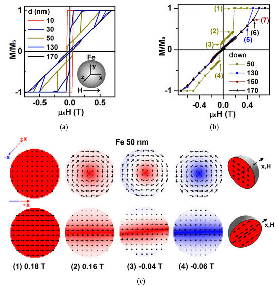 Magnetic hysteresis loops for individual Fe particles with different diameters (H is directed along one of the cubic magnetic anisotropy axes (x)): (a) H from 1 T to −1 T (down) and from −1 T to 1 T (up); (b) H from 1 T to −1 T (down). The numbers correspond to magnetic structures. General view of the magnetic structures of Fe particles (c,d).