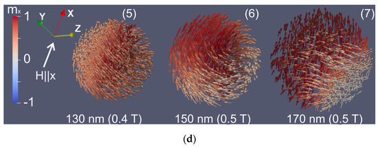 Similar behavior was observed for all particles with diameters larger than 50 nm up to the 130 nm case (Figure 4b). For the MNPs with the diameters below 150 nm, as the field decreases, the magnetization evolves smoothly from uniform saturation to a vortex state via domain wall nucleation, without sudden transitions (Figure 4b,d; the points (6,7)). At zero external magnetic fields, the particles are also characterized by a “core” and “vortex” magnetic structure.