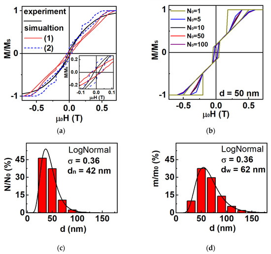 Magnetic hysteresis loops for the ensemble of Fe/FeOX nanoparticles at temperature 293 K: “experiment”—experimental data; “simulation (1)”—simulated magnetic hysteresis loop of the ensemble based on the experimental weight concentration ratio m/m0 (Figure 1d); “simulation (2)”—simulated magnetic hysteresis loop of the ensemble based on the refined weight concentration ratio m/m0 (Figure 5d) (a). Simulated magnetic hysteresis loops for N0 nanoparticles with d = 50 nm and random anisotropy axis orientations (b). Refined particle size distribution of Fe/FeOX ensemble: (c) by number; (d) by weight (dn and dw are number and volume averaged mean diameters, respectively, N0—number of particles).