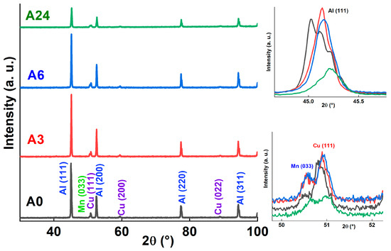 Figure 1 shows the XRD patterns of the A0, A3, A6, and A24 samples. The significant broadening of the Al (1 1 1), Cu (1 1 1), and Mn (0 3 3) diffraction peaks after 24 h of milling (see insets in Figure 1) is due to the diminution of the crystallite size to the nanoscale, the increase in the rate of micro deformations, and the accumulation of defects such as dislocations, grain boundaries, and vacancies.