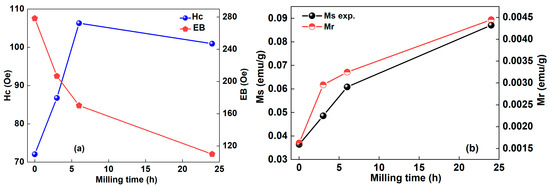 Figure 5a shows the variations in coercivity and exchange bias during milling. The coercivity and exchange bias are calculated using and , respectively; and represent the negative and the positive field values at zero magnetisation. The coercivity increases to approximately 106 Oe during the early milling stage (up to six) due to the pinning of domain walls resulting from the high density of structural defects and microstrains introduced by MA. It may also be related to the increases in the particle size and agglomeration of the powder particles, as cold welding dominates in the early milling stage. Further milling, up to 24 h, decreases the coercivity slightly to ~101 Oe due to refinements in crystallite and particle sizes. Several factors can influence the coercivity, including crystalline defects, dislocations, crystallite size, particle size, magnetocrystalline anisotropy, etc. This is usually observed in the mechanically alloyed powders [35,36,37,38]. The EB declines as the milling time increases to about 110 Oe after 24 h. This decrease can be attributed to microstructural changes during milling, a reduction in the AFM grain size that limits their ability to maintain magnetic anisotropy, and increased lattice strains that reduce the effective coupling between FM and AFM [39,40]. Furthermore, the increased disorder and strains weaken the interfacial exchange coupling, resulting in a decrease in EB upon further milling.