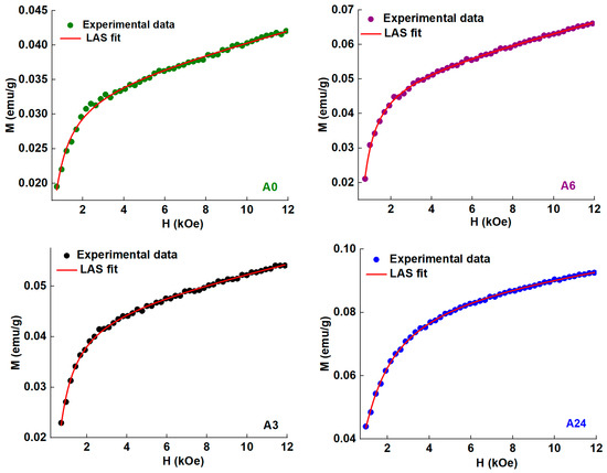 Figure 6 shows the fitting of the hysteresis loops of the A0–A24 powders using the law of approach to saturation (LAS) magnetisation given by the following equation [45]:
