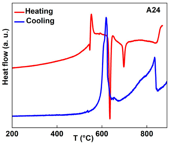 The thermal stability of the A24 powder was studied in the temperature range of 25–900 °C upon heating and cooling at a rate of 10 °C/min under an argon atmosphere. Usually, the phase nucleation, or precipitate dissolution, is characterised by a heat flow peak over the temperature range of the corresponding reaction. Consequently, the coexistence of several exothermic and endothermic peaks in the 400–900 °C range in the heating and cooling DSC curves (Figure 7) can be related to recovery, strain relaxation, melting, recrystallisation, and phase transformations. Those peaks confirm the heterogeneity of the ball-milled powders, as revealed by XRD, through the presence of a mixture of A, Cu, and Mn solid solutions.