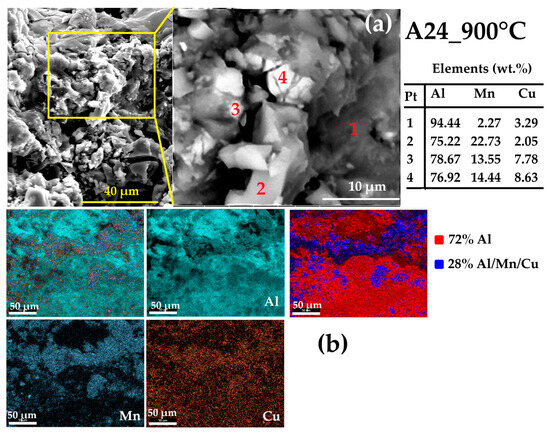 Figure 9a shows the morphology of the A24_900 °C powder, which reveals the particle size and shape distributions. The punctual analysis indicates three types of particles with different elemental compositions. The dark grey particles (point 1) are attributed to the enriched Al(Mn, Cu) solid solution containing 2.27 wt. % Mn and 3.29 wt. % Cu. The dirty white particles (point 2) with 75.22 wt. % Al, 22.73 wt. % Mn, and 2.05 wt. % Cu can be related to the Mn-enriched Al(Mn, Cu) solid solution, while the white particles (points 3 and 4) with approximately 78 wt. % Al, 14 wt. % Mn, and 8 wt. % Cu can be linked to the Al20Cu2Mn3 T-phase, thus confirming the XRD results. These observations are also confirmed by the elemental EDS map (Figure 9b), which shows the presence of the Al-enriched matrix constituting 72% of the investigated area and 28% related to a Mn/Cu-rich T-phase, in agreement with the phase’s weight fraction from the XRD data. This indicates solid solution decomposition and the formation of a thermodynamically stable intermetallic. One also notes that Cu is more homogeneously distributed in the Al matrix than Mn, which is localised mainly in the T-phase region (point 2).