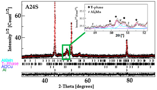 The crystal structure refinement of the A24S sample was performed with four phases: FCC Al solid solution, orthorhombic Al6Mn (space group Ccmm No. 63, a = 6.4978 Å, b = 7.5518 Å, and c = 8.8703 Å), tetragonal Al2Cu known as the θ-phase in the Al-Cu binary phase diagram (space group I4/mcm No. 140, lattice parameters a = b = 6.067 Å, and c = 4.877 Å), and orthorhombic Al20Cu2Mn3. The refined lattice parameters, average crystallite size, and weight fractions are gathered in Table 5. The sintering temperature (500 °C) is appropriately high to activate the diffusion of Cu and Mn atoms, enabling the nucleation and growth of the intermetallic phases. Due to the limited solid solubility of Mn and Cu in Al at RT, Mn and Cu tend to precipitate as stable Al6Mn and Al2Cu intermetallic dispersoids during sintering. The Al6Mn phase is thermodynamically favoured in Al-rich alloys with an adequate Mn content and reduces the supersaturation of Mn in the Al matrix upon its formation. Similarly, the precipitation of Al2Cu reduces the Cu content in the solid solution, contributing to the mechanical strengthening mechanism [51]. The Al20Cu2Mn3 T-phase forms through the combined segregation and reaction of Cu and Mn atoms in the Al matrix during sintering. The T-phase, known for its thermal stability and increase in heat resistance of the alloy [52,53,54], precipitates through the decomposition of the supersaturated Al solid solution enriched in Cu and Mn during sintering. The same phases were identified by Yakovtseva et al. in a cast Al-14.3 Mn-6.5 Cu (in wt. %) alloy after solidification, followed by annealing at 520 °C for 24 h, confirming the presence of the Al solid solution, Al6Mn, Al2Cu, and the T-phase (Al20Cu2Mn3) [7,14].