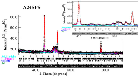 - Conventional sintering of the A24 powder (A24S) at 500 °C for one hour leads to the precipitation of Al6Mn, Al2Cu, and Al20Cu2Mn3 T-phase into the Al-enriched matrix. In contrast, the crystal structure of the consolidated powders by SPS (A24SPS) consists of an Al solid solution, Al6Mn, T-phase, and α-Mn.