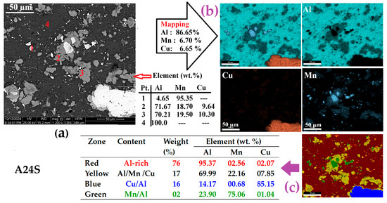 The alloy’s microstructure after different consolidation processes (A24S and A24SPS) reveals distinct morphological and compositional evolutions. The SEM-EDS analyses of the A24S sample (Figure 12) indicate a heterogeneous distribution of the Al, Mn, and Cu elements into four distinct areas related to (i) an Al-enriched matrix (red area) containing 95 wt. % Al, 2.56 wt. % Mn, and 2.07 wt. % Cu; (ii) Al/Mn/Cu (yellow area), with ~70wt. % Al, ~22 wt. % Mn, and ~8 wt. % Cu; (iii) Cu-enriched Cu-Al (blue area) formed by about 85 wt. % Cu and 15 wt. % Al; and (iv) Mn-enriched Mn-Al (green area) containing approximately 75 wt. % Mn and 24 wt. % Al. Based on the XRD results, the four areas can be related to the formation of the Al solid solution (red area), intermetallic Al20Cu2Mn3 T-phase (yellow area), Al6Mn (green area), and Al2Cu (blue area), representing 76, 17, 2, and 16%, respectively, of the total area. The EDS mapping analysis reveals an Al-based (86.65 wt. %) matrix containing 6.7 wt. % Mn and 6.65 wt. % Cu.