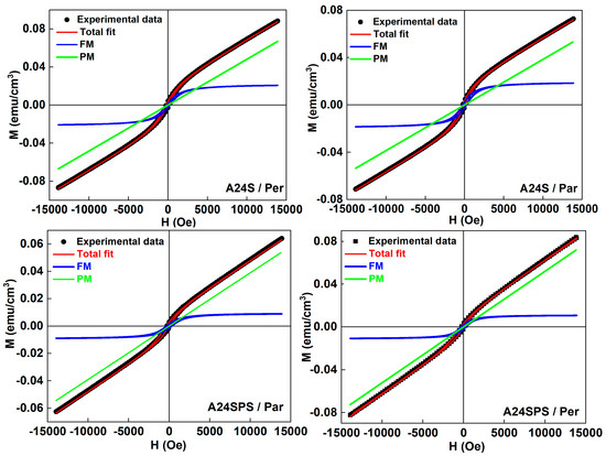 The first term represents the FM hysteresis curve, and the second term is a linear contribution related to a possible AFM contribution due to the presence of MnAl solid solutions. The fitting results are gathered in Table 9. The difference in the percentage of the FM contribution, which represents ~14.5% in the A24SPS and ~26.5% in the A24S samples, might be related to the weight fractions of FM precipitates.
