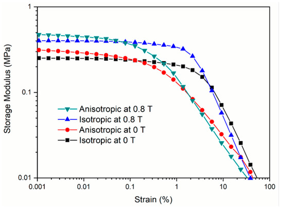 To clearly illustrate the presence of the linear viscoelastic (LVE) region, strain sweep tests from a study conducted by [100] were presented. These curves, plotted on a logarithmic scale, show the storage modulus (G′) as a function of strain amplitude (Figure 4). The tests were performed over a strain range of 0.001% to 100%, at a constant frequency of 1 Hz and under magnetic fields of 0 and 0.8 T. Isotropic and anisotropic MRE samples containing silicone rubber and cobalt particles were fabricated.