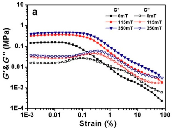 A similar behavior was observed for MRFs, as shown in Figure 5 [68]. In the absence of a magnetic field, the values of (G″) were reported to be larger than those of (G′) in a wide range of strain amplitude, indicating a liquid-like behavior for both MRFs.
