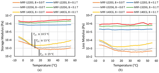 Regarding MR fluids, a study conducted by Hemmatian and colleagues [132] serves as an example of the temperature dependence of the viscoelastic properties of these fluids. Three different hydrocarbon-based fluids were prepared (MRF-122EG, MRF-132DG, and MRF-140CG) containing iron particles of 3–10 µm. The base fluid used was a synthetic oil. The test series shown in Figure 11 was performed at a fixed strain and frequency (γ = 0.01% and ω = 1 Hz).