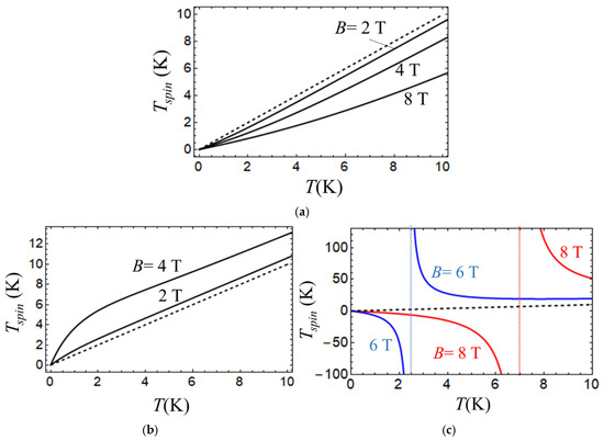 The described features of the thermal processes can be also understood on the basis of the spin-temperature formalism introduced at the end of Section 2. Figure 5 shows the spin temperature Tspin evaluated as function of T for the cases of negative (Figure 5a) and positive (Figure 5b,c) D and different values of the magnetic field. It is seen that at D < 0, the spin temperature is lower than T (Figure 5a), which is the consequence of underpopulation of the excited level (Figure 4a). As a result, the heat is transferred from the phonons that initially have the temperature T to the spin subsystem whose spin temperature is lower than T, and hence, the final temperature Tfin established in course of the relaxation process proves to be lower than the initial temperature T. This is in accord with the negative sign of ΔT (see Figure 2). The difference T–Tspin is the increasing function of B (Figure 5a), which explains that cooling is more efficient for a higher magnetic field (compare, e.g., the curves in Figure 2a found for different B-values).