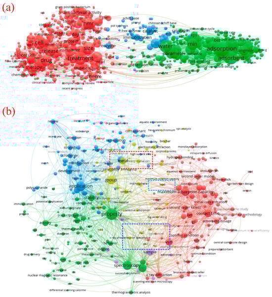 VOS viewer cloud map: (a) keywords ‘magnetic chitosan’; (b) keywords ‘magnetic chitosan’ and ‘adsorption’.