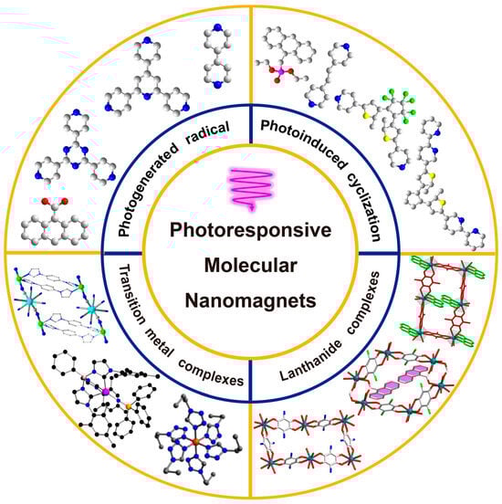 Molecular nanomagnets with photomagnetic properties are primarily synthesized by introducing photoresponsive components, notably SCO units, photo-isomerizing organics, or radical-forming moieties. In transition metal molecular nanomagnets, incorporation of SCO units could facilitate optical switching of spin states to modulate the magnetic properties of SMMs and SCMs [31,32,33,34]. For lanthanide molecular nanomagnets, light-induced ligand transformations such as photocyclization or radical formation could modify the ligand field of the metal center and introduce additional spin carriers, thereby tuning room-temperature magnetic moments and/or dynamic magnetic susceptibilities [27,28,29,30].