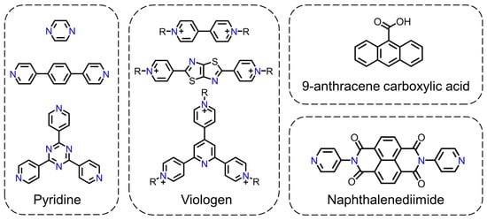 As shown in Figure 3, pyridine derivatives, viologens, triazoles, 9-anthracene carboxylic acids, and naphthalenediimides can be converted to radicals upon light illumination through electronic transition [96,97,98]. In recent years, there has been a growing interest in the study of not only molecular nanomagnets but also multifunctional metal–organic frameworks with photogenerated radicals [99,100,101].