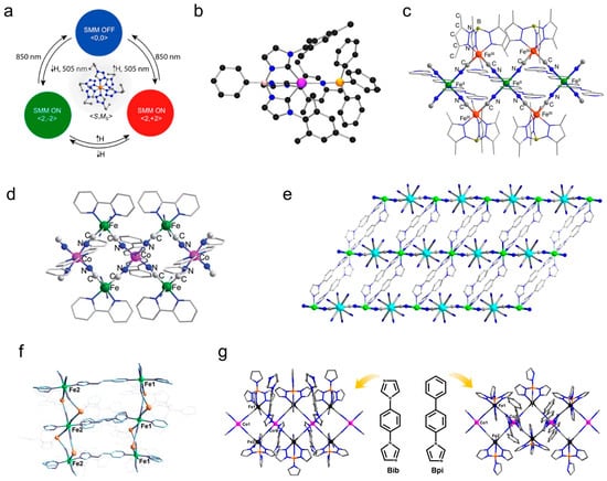 Transition metal molecular nanomagnets with photomagnetic properties. (a) [FeII(1-propyltetrazole)6](BF4)2; (b) PhB(MesIm)3FeII-N = PPh3; (c) {[FeIII(Tp*)(CN)3]2FeII(bpmh)}·2H2O; (d) {[FeIII(bpy)(CN)4]2[CoII(phpy)2]}·2H2O; (e) {[W(CN)8][(FeII)(bib)2](bibH)}·2CH3OH; (f) {[(pzTp)FeIII(CN)3]4FeII2(Pmat)4}n·12H2O; (g) {[pzTpFeII(CN)3]4CoII2(Bib)4}·3H2O and {[pzTpFeII(CN)3]2CoII(Bpi)2}·CH3CN·4H2O. Reprinted with permission from Refs. [15,31,32,102] Copyright 2021 Nature Chemistry, 2013 American Chemical Society, 2013 American Chemical Society, and 2021 Angewandte Chemie International Edition. Reprinted from Refs. [33,34,103].