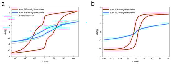 Magnetic hysteresis loops of {[W(CN)8][(FeII)(bib)2](bibH)}·2CH3OH at 1.8 K (a) and 3.3 K (b) after irradiation. Reprinted with permission from Ref. [15]. Copyright 2021 Nature Chemistry.