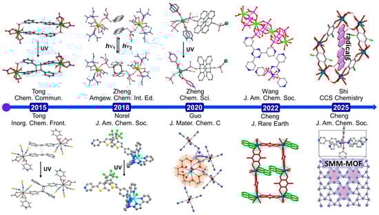 Selected examples of lanthanide molecular nanomagnets with photomagnetic properties. Reprinted with permission from Refs. [27,28,29,30,112,113,116,120,121]. Copyright 2015 Chemical Communications, 2018 Angewandte Chemie International Edition, 2019 American Chemical Society, 2020 American Chemical Society, 2017 Inorganic Chemistry Frontiers, 2021 Chemical Science, 2022 Journal of Materials Chemistry C, 2025 Journal of Rare Earths, 2025 American Chemical Society. Reprinted from Ref. [122].