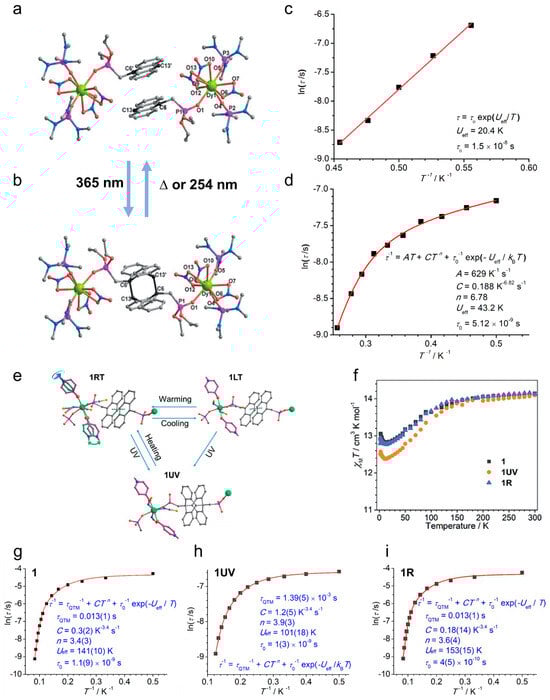 The photochemical reaction from DyIII(depma)(NO3)3(hmpa)2 (a) to DyIII2(depma2)(NO3)6(hmpa)4 (b) via [4,4] photocyclization and their ln(τ) vs. T−1 plots (c,d). Reprinted with permission from Ref. [28]. Copyright 2018 Angewandte Chemie International Edition. Structural transformation among 1RT, 1LT, and 1UV (e). The χMT vs. T (f) and ln(τ) vs. T−1 plots (g–i) for 1, 1UV, and 1R. Reprinted with permission from Ref. [113]. Copyright 2021 Chemical Science.