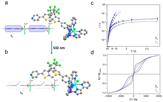Dithienylethene is another photoresponsive ligand. The double bond of ethylene could react with two thiophene groups to form a closed-loop structure under ultraviolet irradiation. Upon exposure to visible light or heating, the closed-loop structure can revert to the open-loop structure, which is a reversible process. In 2020, Bernot’s group reported a one-dimensional Dy(III) complex [Dy(Tppy)F(Lc)]PF6 (1c; Tppy = tris(3-(2-pyridyl)pyrazolyl)hydroborate, L = bispyridyl dithienylethene) with a bispyridyl dithienylethene ligand [29]. Upon irradiation using 532 nm green light, the ligand underwent a transformation from a closed-ring to an open-ring structure, resulting in the formation of the open-ring one-dimensional complex 1o (Figure 10a,b). An in-depth study on the multiple relaxation processes of molecular nanomagnets is crucial for clarifying their dominant mechanisms across different temperature ranges. 1o and 1c exhibited Raman, Orbach, and quantum tunneling relaxation processes with the same effective energy barrier of 225.9 K. Here, τ−1 = τQTM−1 + τ0−1exp(−Ueff/kBT) + BTn was used to fit the relaxation data [19]. 1o and 1c showed the Orbach process at a high temperature range and QTM at a low temperature range. However, 1o (τQTM = 0.0015 s) demonstrated a faster quantum tunneling rate compared to 1c (τQTM = 0.0337 s), and exhibited narrower hysteresis loops (Figure 10c,d). Ab initio calculations indicated that the photomodulation of the magnetic properties originated from the change in crystal packing rather than ligand isomerization-induced crystal field splitting.