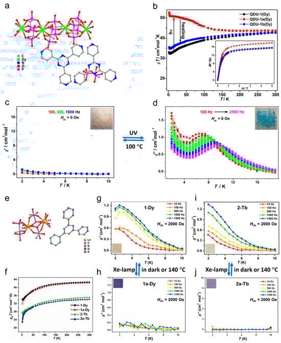 The structure of QDU-1 (a). The χMT–T (b) and ac susceptibilities (c,d) of QDU-1, QDU-1a, and QDU-1b. Reprinted with permission from Ref. [30]. Copyright 2020 American Chemical Society. The structure of 1-Ln (e). The χMT–T (f) and ac susceptibilities (g–j) of 1-Dy, 1a-Dy, 2-Tb, and 2a-Tb. Reprinted with permission from Ref. [115]. Copyright 2022 Science China Materials.
