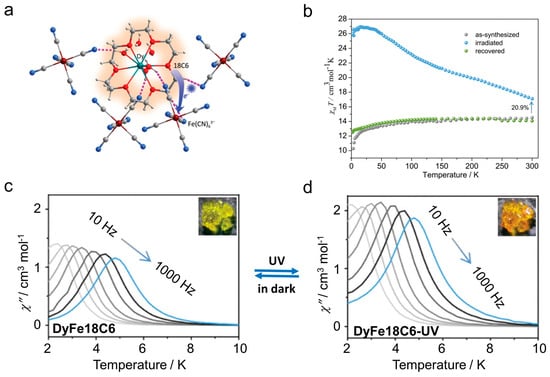The photogenerated crown radicals were proven to be a means to modulate the magnetization of lanthanide complexes. Guo’s group reported a crown-based complex, [DyIII(18C6)(H2O)3]FeIII(CN)6·2H2O (DyFe18C6) [116] (Figure 12a). At room temperature and under UV irradiation, yellow DyFe18C6 transformed into orange DyFe18C6-UV, accompanied by the generation of radicals. Heating at 75 °C for 2 h or storing in darkness for 7 days restored the complex to its initial state. The obtained compound exhibited photochromic and photomagnetic behaviors at room temperature, demonstrating a transition from paramagnetic to ferromagnetic states and a remarkable enhancement of χMT by 20.9% (Figure 12b). DyFe18C6 and its photoproducts had effective energy barriers of 18.4 and 17.0 K, respectively (Figure 12c,d).