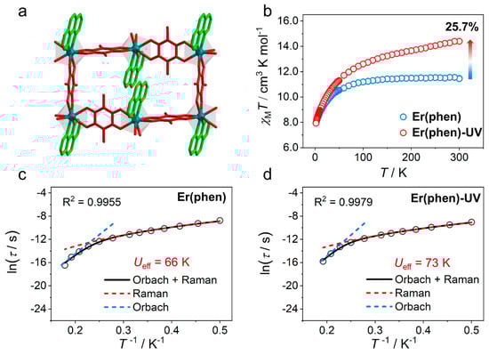 The structure of Er(phen) (a). The χMT–T (b) and ln(τ)–T−1 plots (c,d) for Er(phen) and Er(phen)-UV. Reprinted with permission from Ref. [120]. Copyright 2025 Journal of Rare Earths.