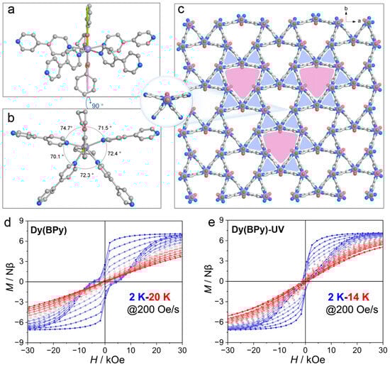 Structure of [Dy(OPh)X(BPy)4(THF)]+ (X = Cl/PhO−) cation in Dy(BPy) viewed from the side (a) and from above (b). Kagomé layer of Dy(BPy) (c). The magnetic hysteresis loops of Dy(BPy) (d) and Dy(BPy)-UV (e). Reprinted with permission from Ref. [121]. Copyright 2025 American Chemical Society.