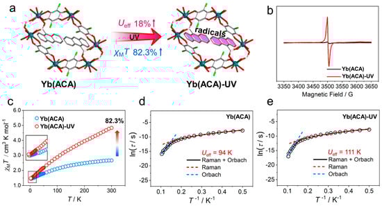The photochemical reaction from Yb(ACA) to Yb(ACA)-UV (a). EPR spectra of Yb(ACA) and Yb(ACA)-UV (b). The χMT–T (c) and ln(τ)–T−1 plots (d,e) of Yb(ACA) and Yb(ACA)-UV. Reprinted from Ref. [122].