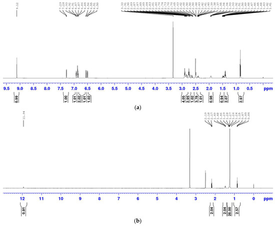 The 1H NMR spectrum of stearic acid, shown in Figure 1b, is 1H NMR (DMSO-d6, 600 M) δ 11.94 (s, 1H, 1-OH), 2.18 (t, J = 7.51 Hz, 2H, 2-H), 1.47 (t, J = 6.9 Hz, 2H, 3-H), 1.10–1.35 (m, 28H, 4–17-H), and 0.85 (t, J = 6.3 Hz, 3H, 18-H).