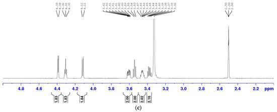 The 1H NMR spectrum of mannitol, depicted in Figure 1c, is 4.40 (d, J = 5.55 Hz, 2H, 2,5-OH), 4.32 (t, J = 5.72 Hz, 2H, 1,6-OH), 4.13 (d, J = 7.08 Hz, 2H, 3,4-OH), 3.65–3.57 (m, 2H, 1,6-H), 3.54 (d, J = 7.8 Hz, 2H, 3,4-OH), 3.49–3.41 (m, 2H, 2,5-H), and 3.40–3.28 (m, 2H, 1,6-H).
