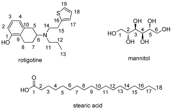 The 1H NMR spectra of rotigotine, stearic acid, and mannitol reference standards were acquired (Figure 1), and their corresponding signals were assigned. The structures of rotigotine, stearic acid, and mannitol are depicted in Figure 2.